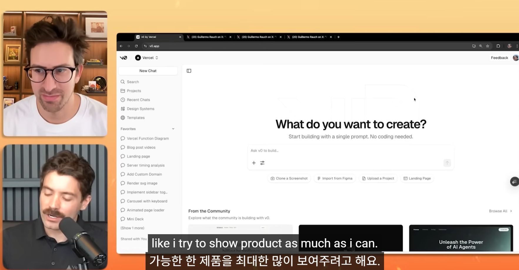 기예르모는 실제로 자기 회사 블로그에 새로운 기능을 추가할 때, 슬랙으로 10개의 메시지를 보내는 대신 그냥 v0에 들어가서 자기가 원하는 걸 프롬프트로 뚝딱 만들어 버린대. "여기엔 이런 기능이 있고, 비디오 마커를 누르면 이렇게 점프했으면 좋겠어." 이렇게 만든 '살아있는 프로토타입'을 팀에 공유하면 그걸로 끝이야. 커뮤니케이션 비용이 0이 되는 거지.