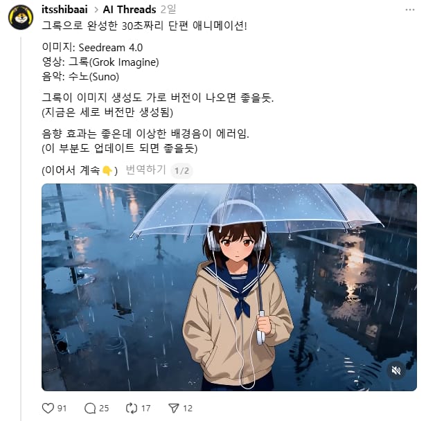 요즘 대세인 그록으로 만들어본 30초짜리 애니메이션이야. Seedream 4.0으로 이미지 생성하고 그록으로 영상 생성해서 간단한 편집만 했어. 영상 궁금하면 스레드에서 꼭 확인해봐!