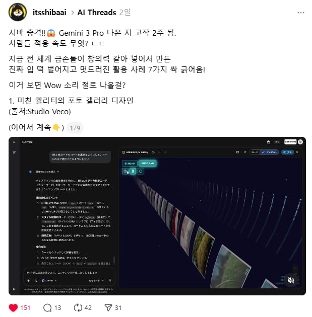 Gemini 3 Pro가 나온지 2주 되었는데 전 세계 사람들이 아이디어 + 창의력을 발휘해서 정말 다양한것들을 만들어내고 있어. 어떤걸 만들어내는지 궁금하면 꼭 확인해봐!
