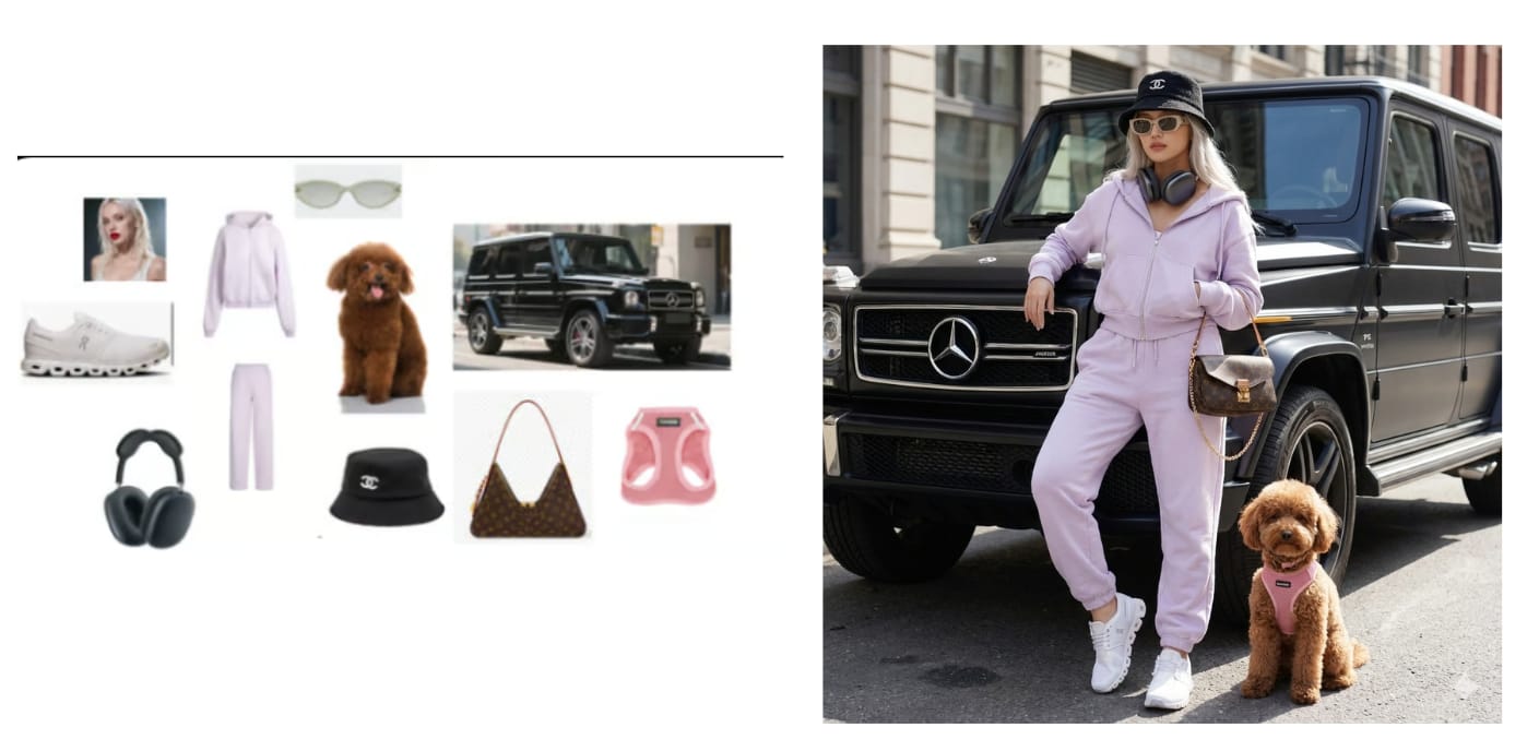 The model is naturally leaning against a Mercedes. She is wearing a lilac hoodie, matching sweatpants, white sneakers, a black Chanel bucket hat, and sunglasses. She has a Louis Vuitton handbag on her shoulder. The model also has black headphones hanging around her neck. Next to her, a brown poodle is sitting, wearing a pink harness.