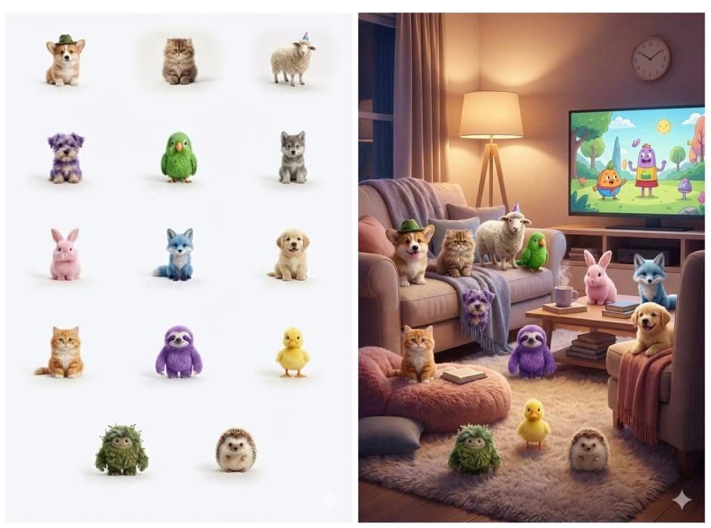 이미지 속 캐릭터들이 모두 함께 모여 TV를 보고 있는 장면을 만들어줘.