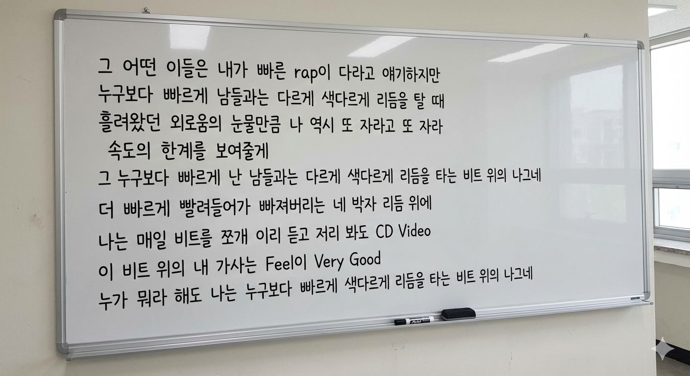 깨끗한 화이트보드에 다음과 같은 단정한 손글씨 한글 문구가 적혀 있다:
